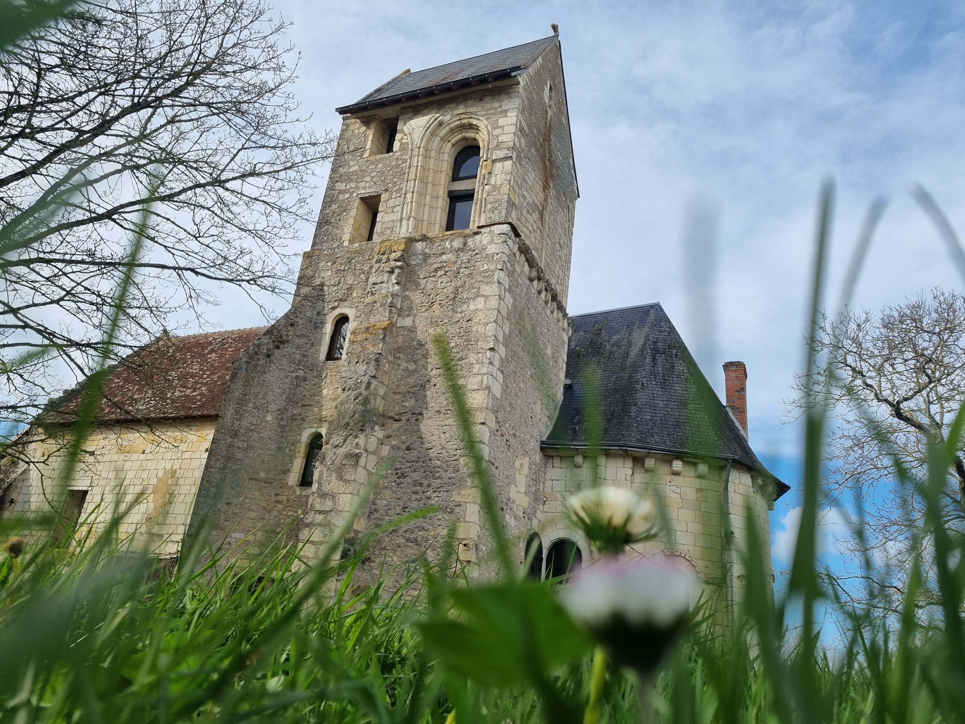 Le clocher, quant à lui, date probablement du XIIe siècle et les baies de l’étage supérieur sont plus récentes, datant peut-être du XVe siècle. La nef, qui a été ajoutée à la fin du XIIe siècle ou dans la première moitié du XIIIe siècle, a été surélevée plus tard, comme en témoignent les réhausses des pignons. La porte originale de la façade occidentale a été démontée en 1907 et transférée à l’ancienne abbaye de Villeloin. Elle a été perdue pendant près de quatre-vingt-dix ans avant d’être redécouverte récemment dans les collections du Cloisters Museum de New York. La porte actuelle date du XVIIe siècle et ressemble étrangement à l’entrée de l’hôtel de l’argentier du roi à Tours appelé aussi l’hôtel Jean Galland ou bien encore hôtel Babou de la Bourdaisière, peut-être le même artisan.
